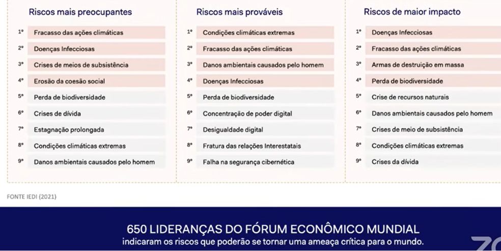 As maiores ameaças e riscos globais atualmente. Quadro tirado da aula da Profa. Dra. Tereza Campello – Professora Visitante da FSP-USP e Ex-Ministra do Ministério do Desenvolvimento Social e Combate à Fome Camila Paulini