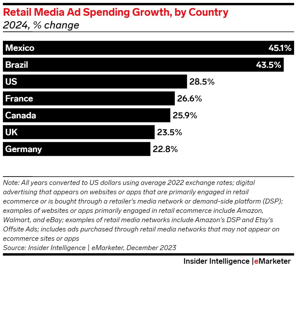Advertisers in Brazil and Mexico, starting from a relatively low base, intend to boost their retail media ad spending this year at a rate that is more than double the global rate of 21.8%.
