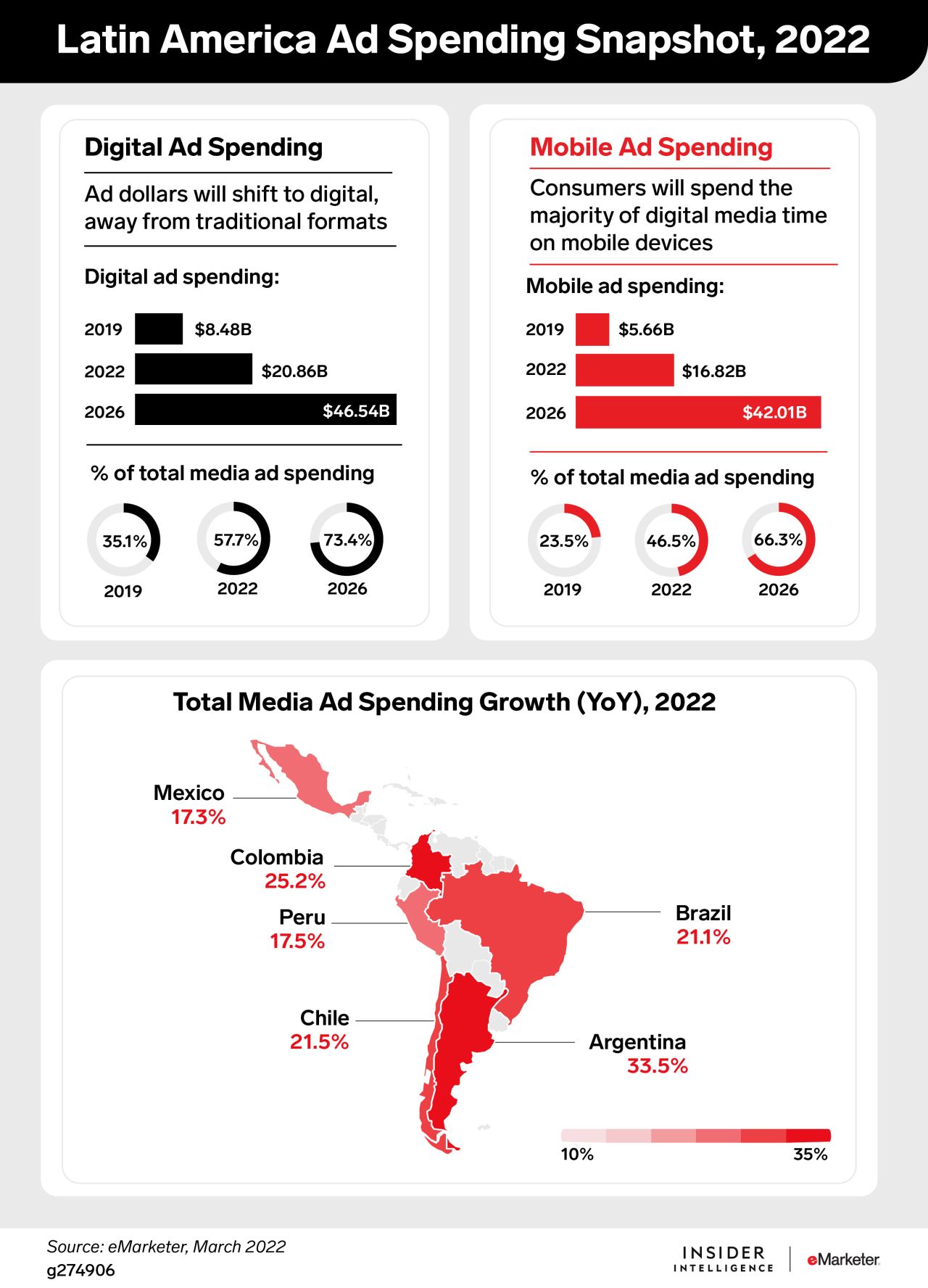 The LATAM region's rapid economic recovery will revitalize advertising spending in 2023. e-Marketer forecasts the Latin America ad market to grow to US$36.16 billion by 2022 – almost US$10 billion more than previously forecast .